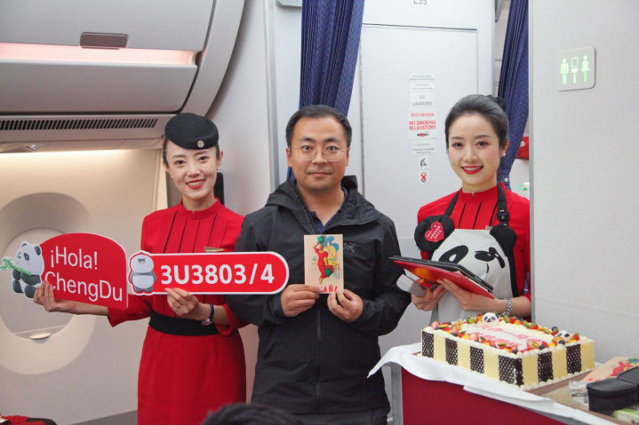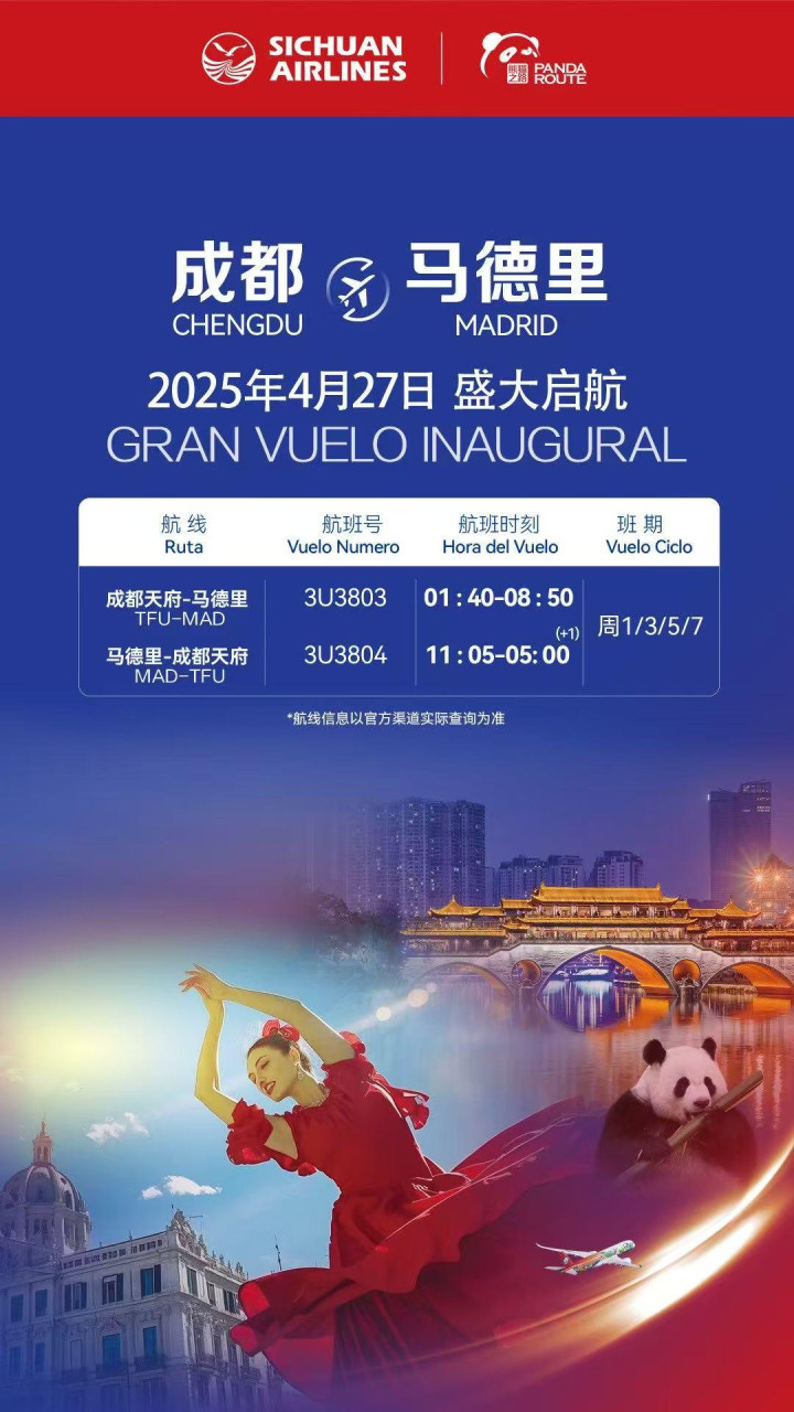西班牙当地时间4月27日07:01(北京时间13:02),3U3803航班平稳降落在马德里机场,标志着四川航空(以下简称“川航”)成都直飞西班牙马德里航线正式开通。这是四川航空持续推进“熊猫之路”国际化战略、助力成都加快建设国际门户枢纽迈出的新步伐。川航采用A350熊猫彩绘飞机投入该航线运营,每周四班,周1357执飞。